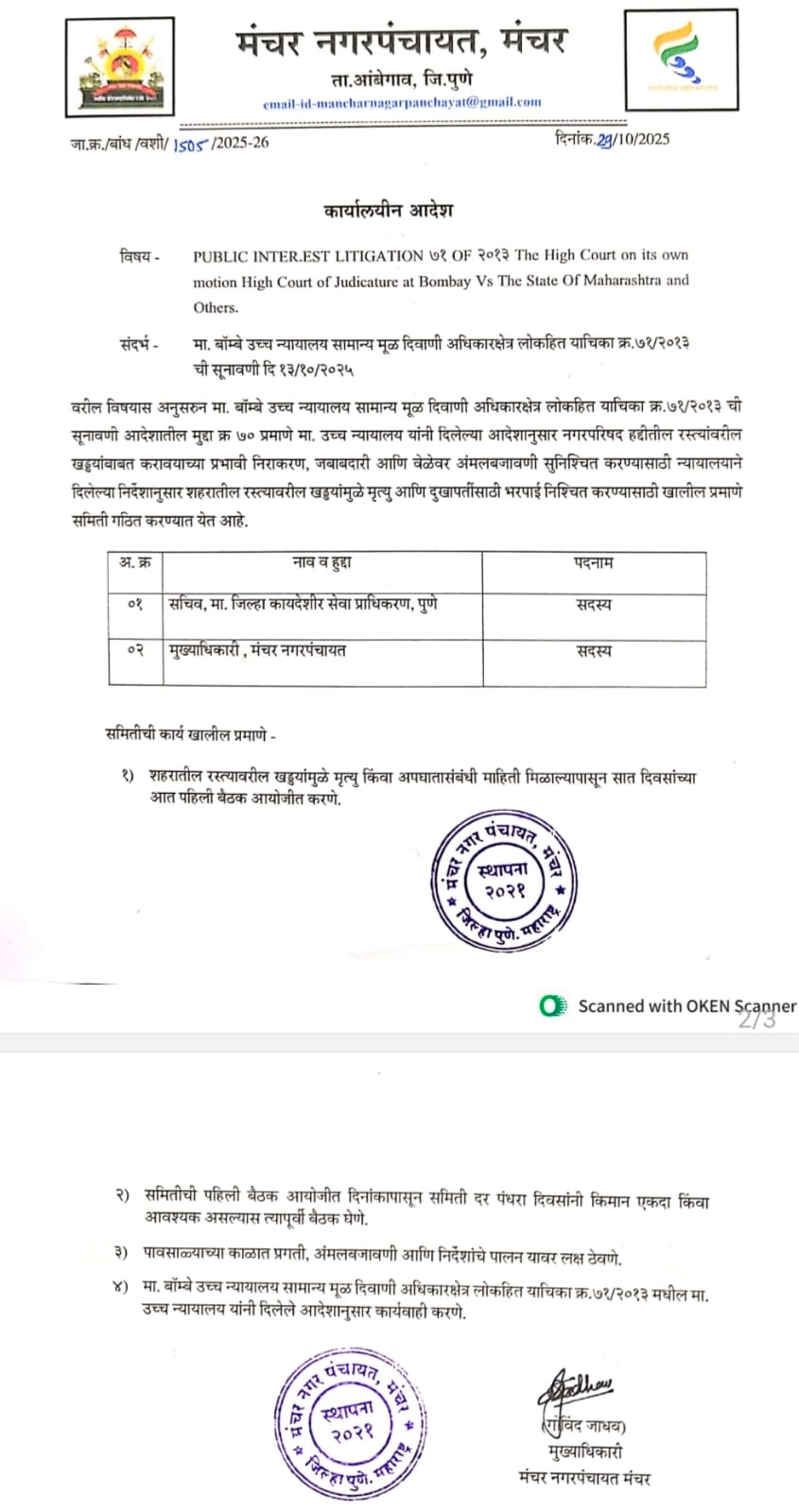 Manchar Nagar Panchayat ULB code is 900867 , Tal. Aambegaon ,Dist. Pune.